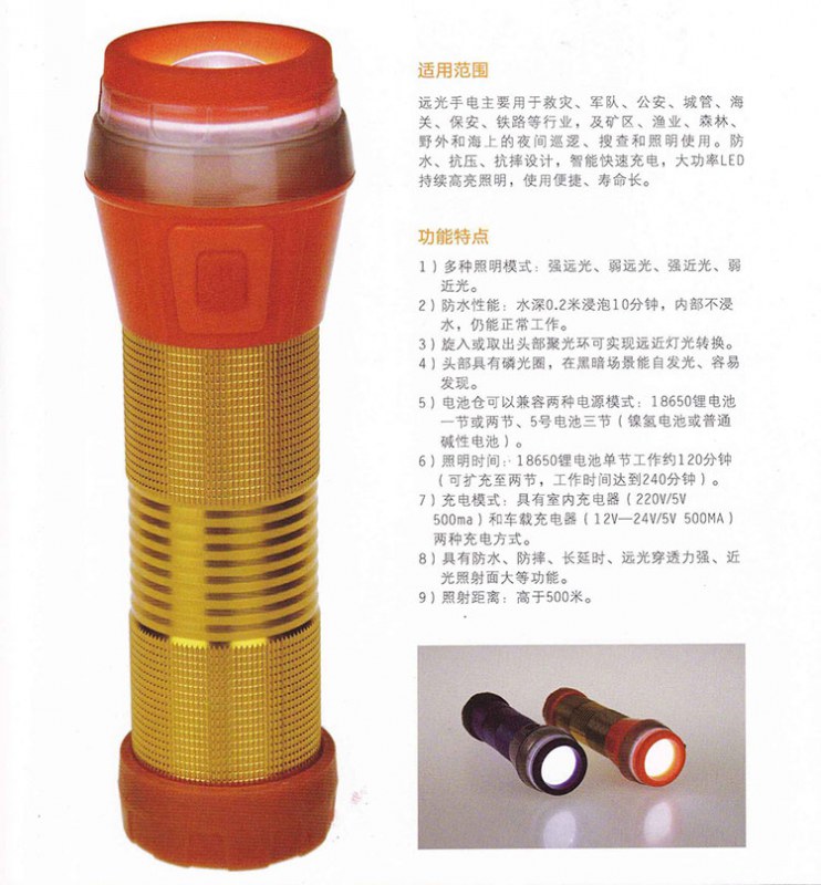 主要用于應急部門、救災人員在夜晚的巡查、搜查和照明使用。防水、抗壓、抗摔設計,智能快速充電,大功率LED持續照明,使用便捷、壽命長。