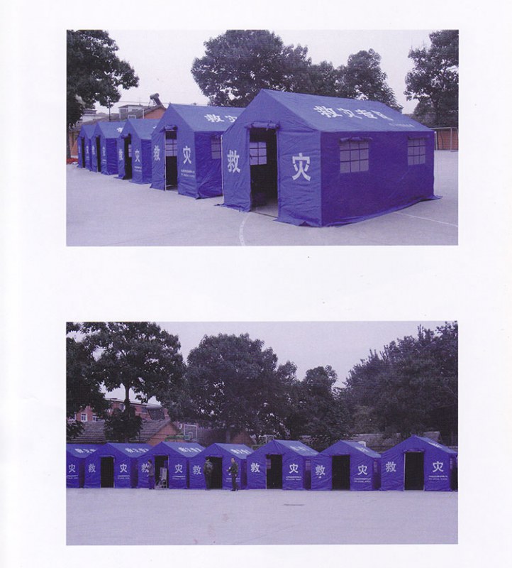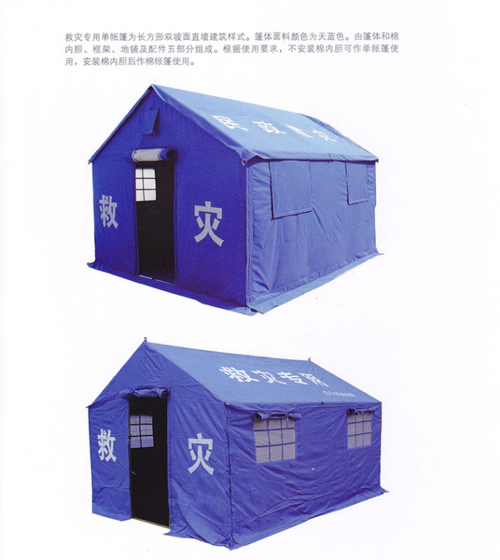 長(zhǎng)方形雙坡面直墻建筑樣式,蓬體面料顏色為天藍(lán)色,由蓬體和棉內(nèi)膽、框架、地鋪及配件五部分組成。根據(jù)使用要求,不安裝棉內(nèi)膽可作為單帳篷使用,安裝棉內(nèi)膽后作棉帳篷使用。