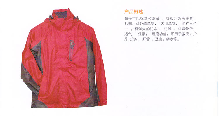 帽子可以拆卸和隱藏,衣服分為兩件套,拆卸后可外套單穿,內膽單穿,簡稱三合一;有強大得放水、防風、防紫外線,透氣、保暖、耐磨功能,可用于救災,戶外郊游,野營、登山、攀冰等。